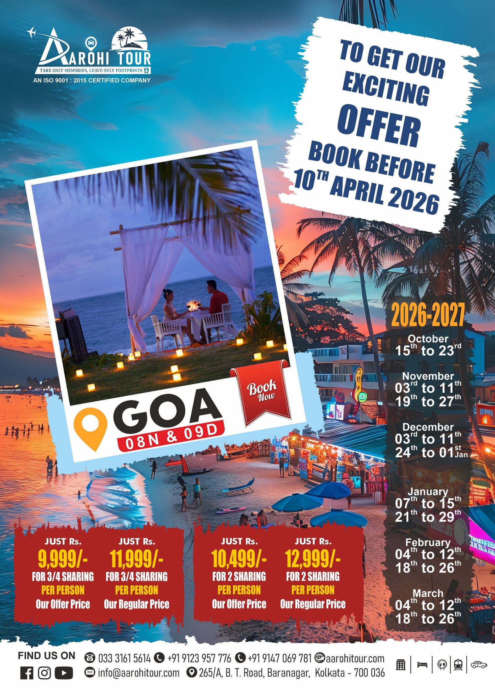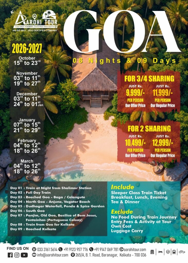 Experience the best of Goa with our 8 Nights 9 Days Goa Tour Package, designed for travelers who want to explore Goa at a relaxed pace. This extended trip covers both North Goa and South Goa, along with leisure days to enjoy beaches, nightlife, and local culture. From famous beaches like Baga and Calangute to peaceful destinations like Palolem, this tour offers a perfect balance of adventure and relaxation. Enjoy water sports, sunset views, historical churches, and vibrant markets. With Aarohi Tour, you get comfortable stays, smooth transportation, and a hassle-free travel experience for a memorable Goa holiday.