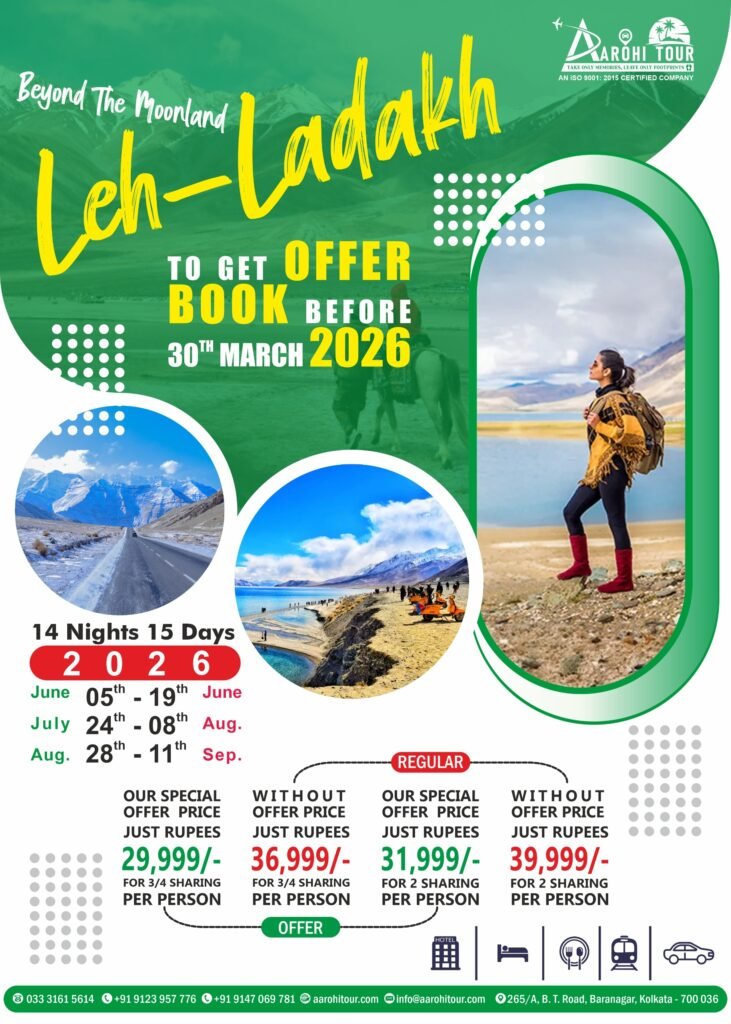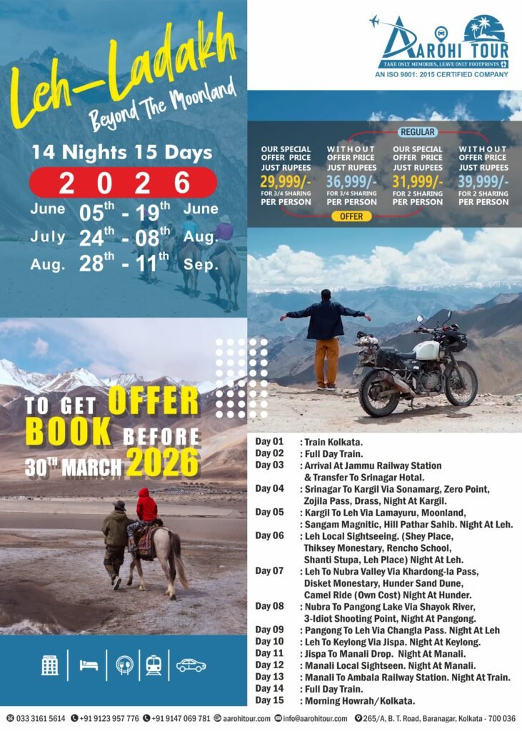 Leh–Ladakh Tour Package 14 Nights 15 Days offers an unforgettable journey through one of India’s most breathtaking mountain destinations. This tour is perfect for travelers who want to experience the raw beauty of Ladakh, including Leh, Nubra Valley, Pangong Lake, monasteries, high mountain passes, and scenic Himalayan landscapes. From peaceful monasteries and crystal-clear lakes to thrilling road journeys and cultural experiences, every day of this Ladakh trip brings something unique. Designed for comfort and adventure, this tour is ideal for families, couples, and group travelers looking for a well-planned and memorable Leh–Ladakh travel experience from Kolkata with Aarohi Tour.