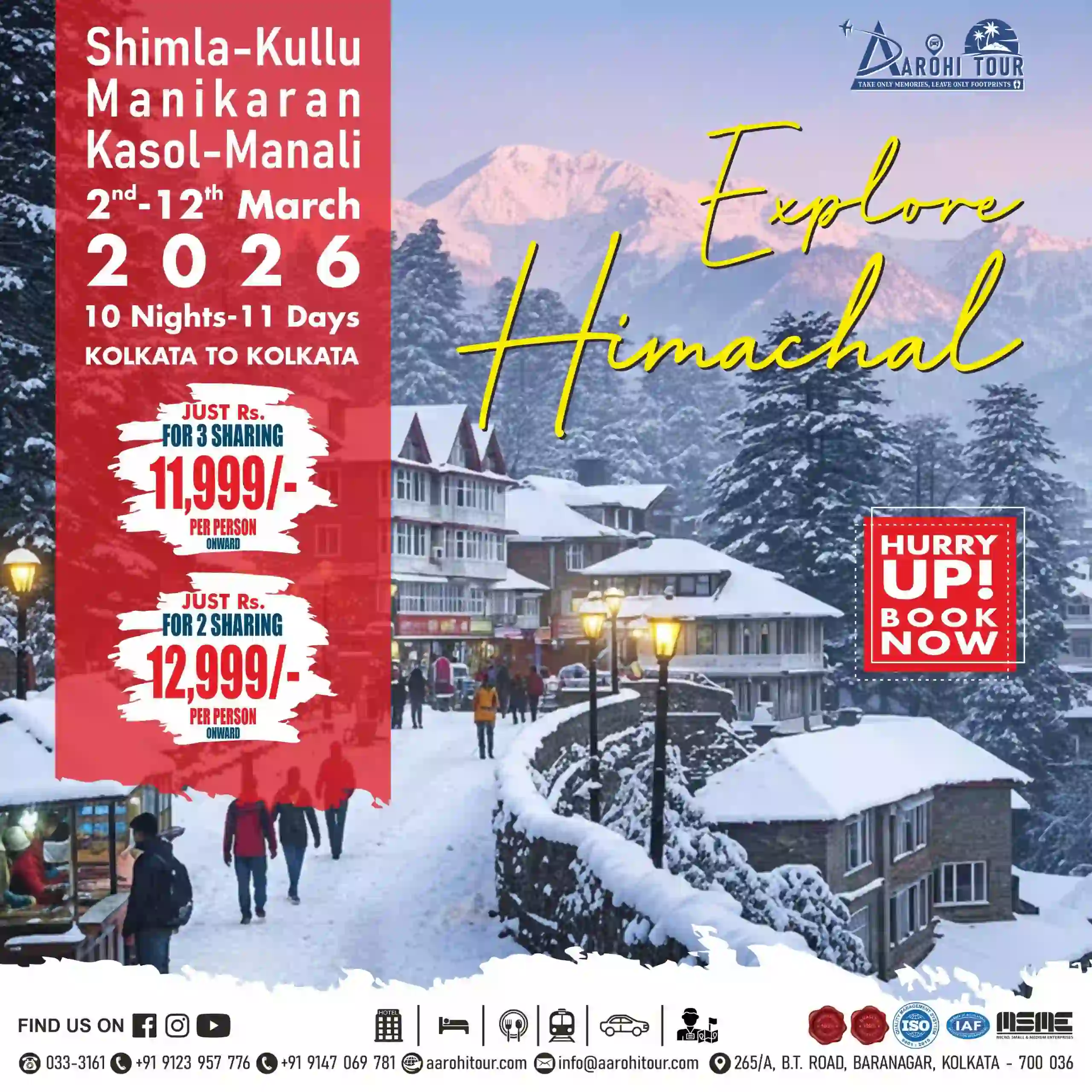 Our 10 Nights / 11 Days Shimla–Kullu–Manikaran–Kasol–Manali Himachal Tour offers a refreshing and scenic journey through the majestic Himalayas. Starting and ending in Kolkata, this tour is crafted for travelers seeking a peaceful, comfortable, and memorable holiday experience. Explore Shimla’s colonial charm, enjoy the serene valleys of Kullu, feel the spiritual essence of Manikaran, relax in the natural beauty of Kasol, and experience the snow-covered landscapes of Manali. Perfect for families, couples, and groups, this itinerary ensures smooth travel, comfortable stays, and a delightful combination of nature, adventure, and culture throughout the entire trip.